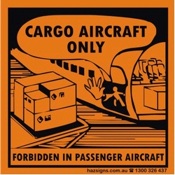 Cargo Aircraft Only - a warning that the package must not be carried on an aircraft with passengers. Available in various sizes and materials. This Label is required on all consignments containing dangerous goods that can only be shipped on a cargo aircraft. All Labels are compliant with IATA DGR, ICAO and 49 CFR requirements for labelling dangerous goods shipments. (NSN - 7690-66-134-0694 Size 200mm)