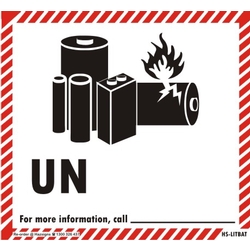 For the safe labelling of Lithium batteries. Compliant with Air, Sea & Road Dangerous Goods requirements. This generic label can be used for all lithium battery types. Simply fill in UN Number and phone number. New label requirement as at 1st January 2019.